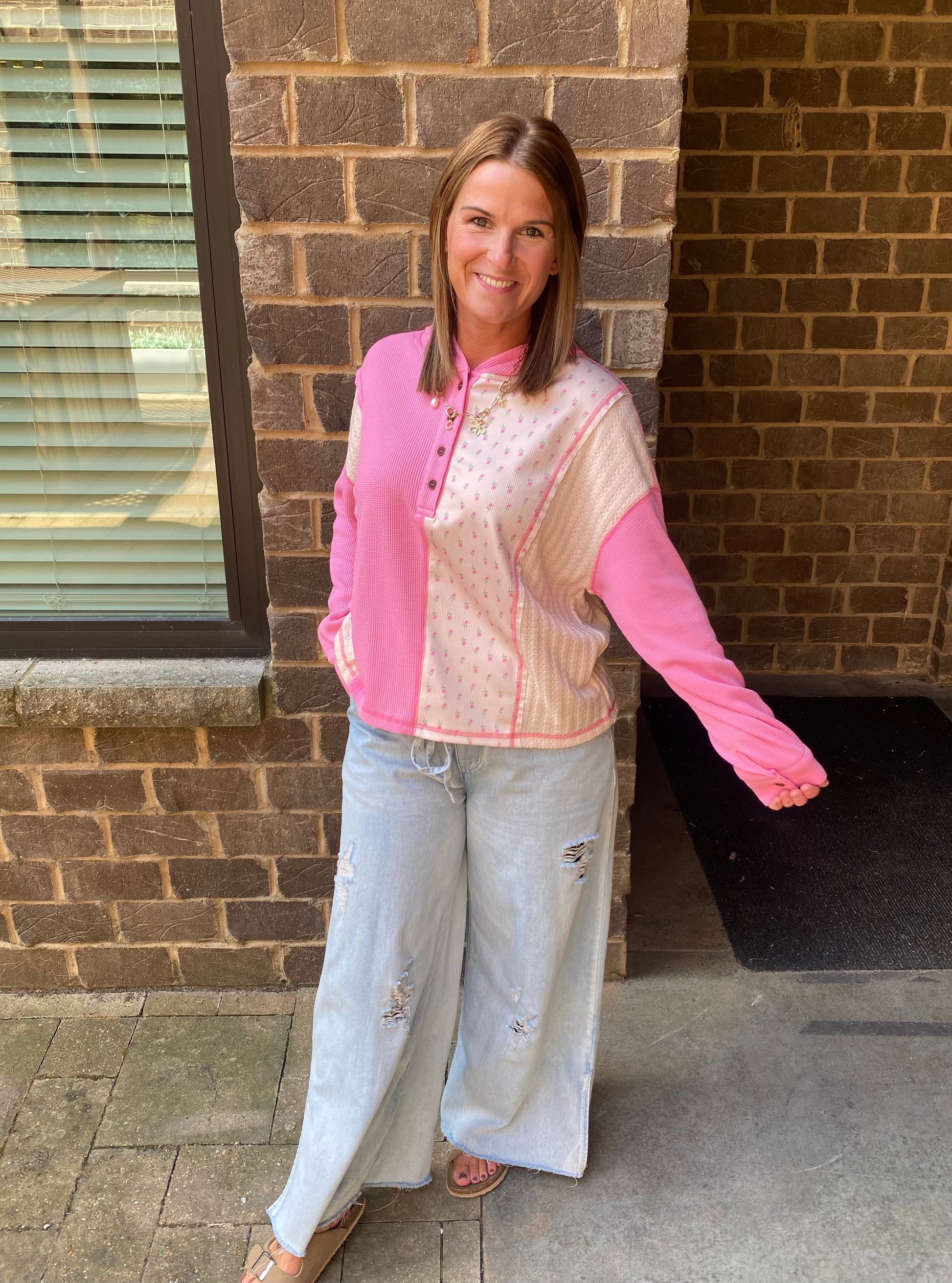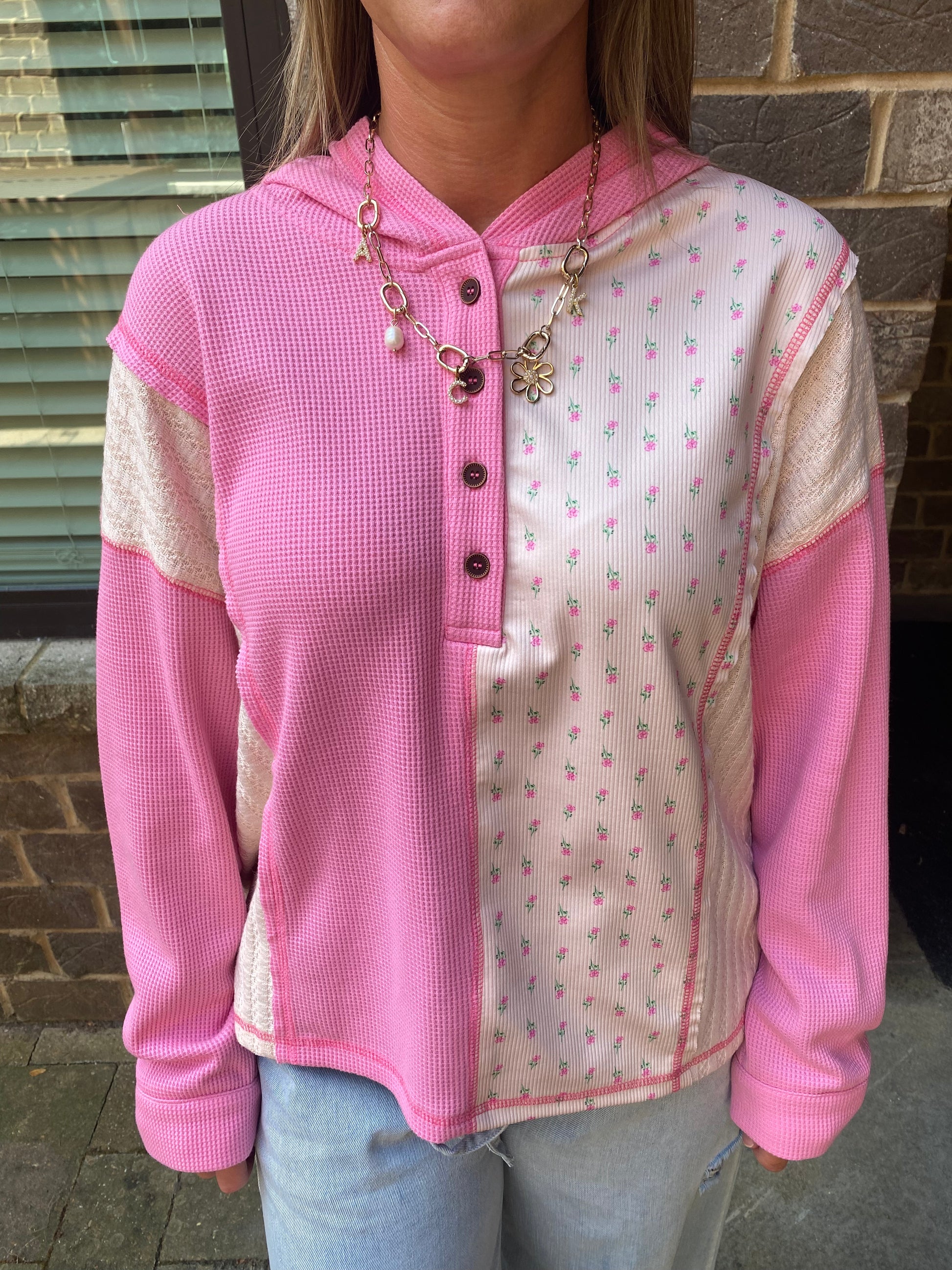 Floral Patchwork Waffle Hooded Oversized Pullover, Pink