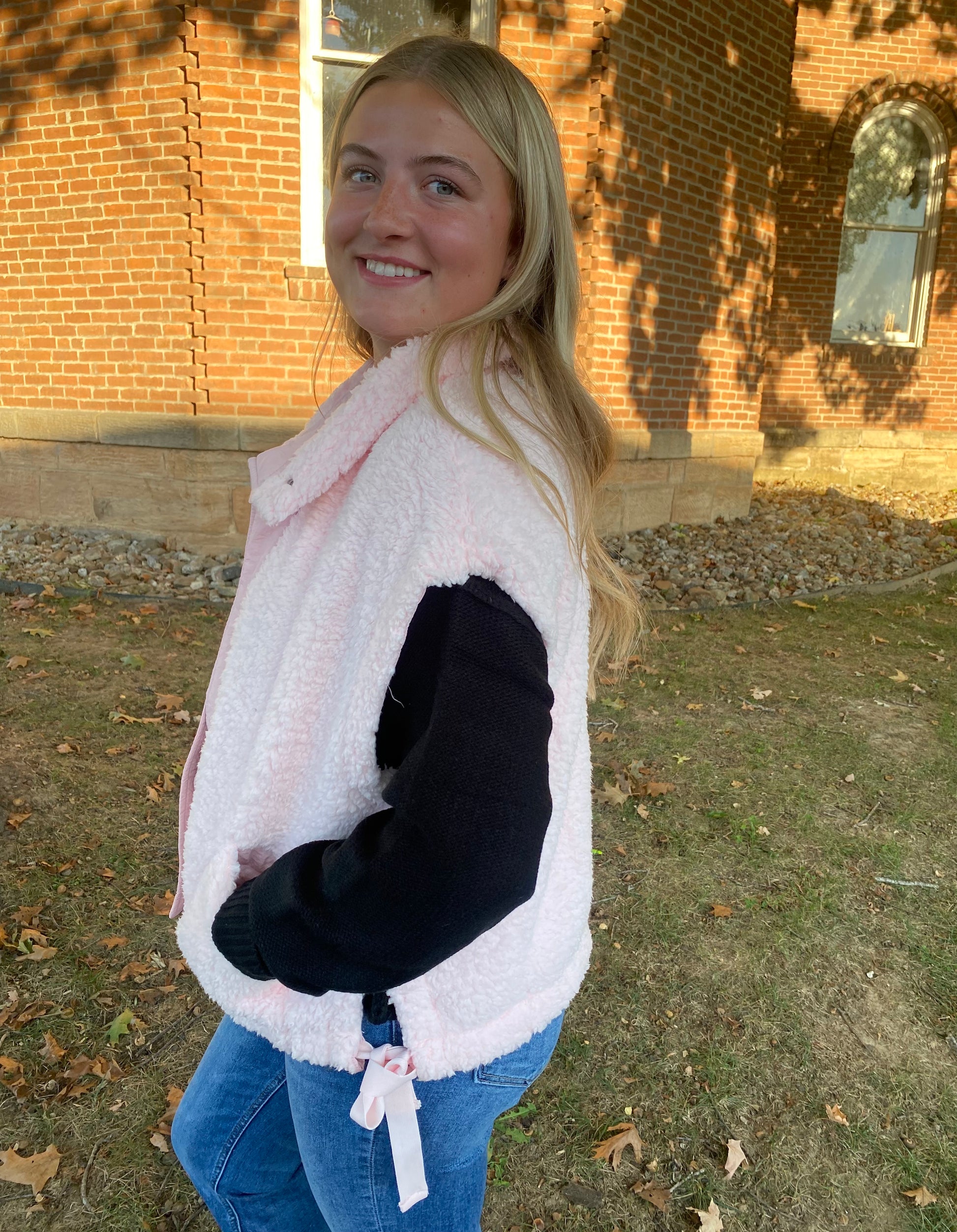 Side Bow Oversized Sherpa Vest, Mocha, Pink