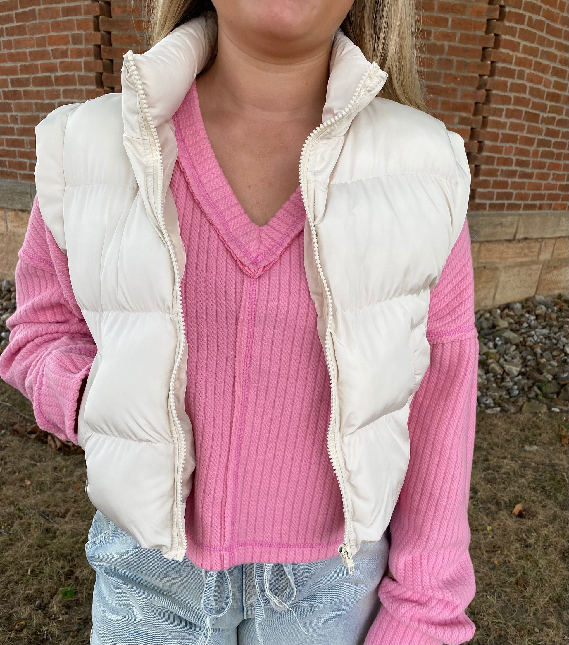 Side Bow Tie Front Zipper Crop Puffer Vest, Ecru
