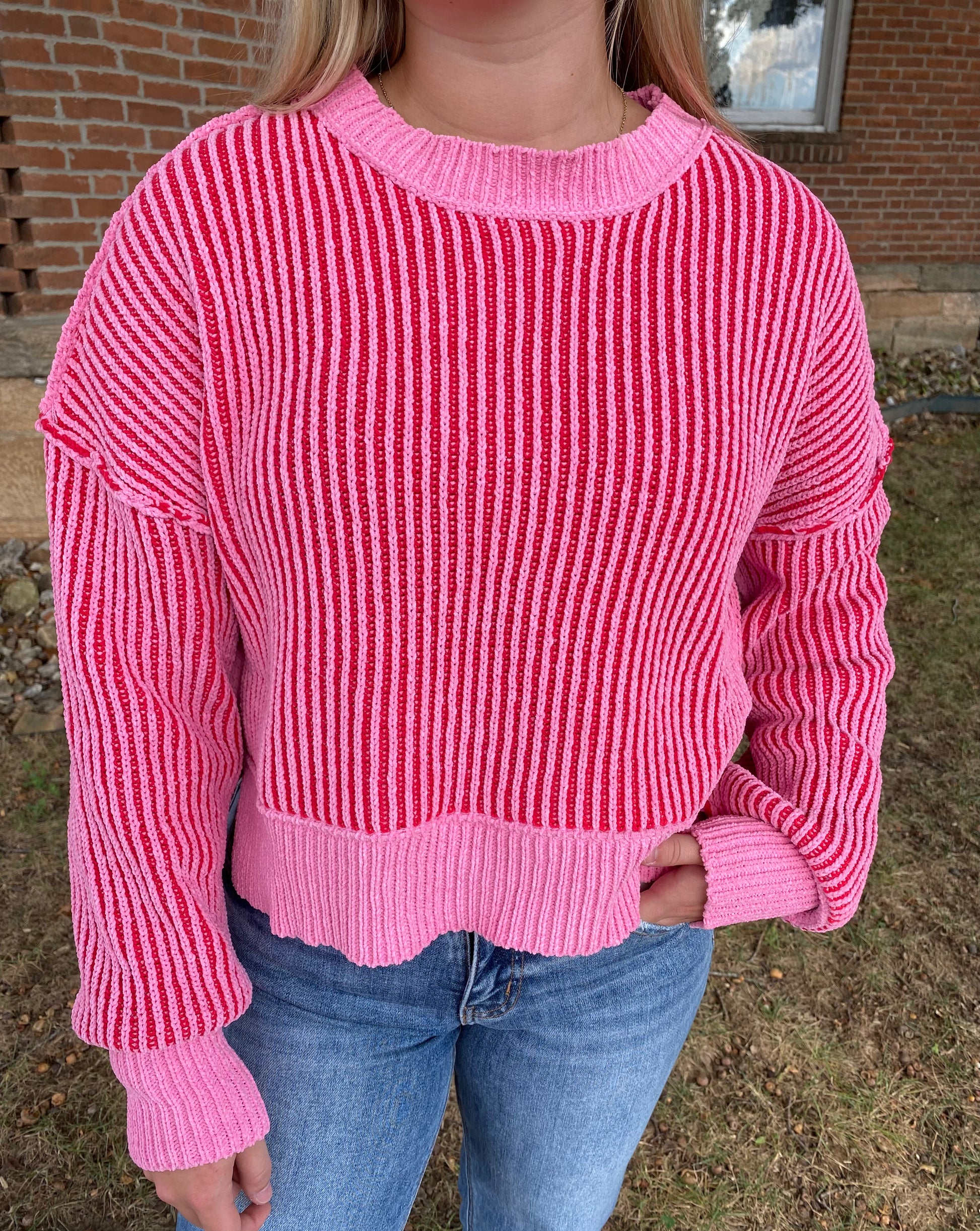 Two Tone Striped Casual Stripe Sweater Top, Pink