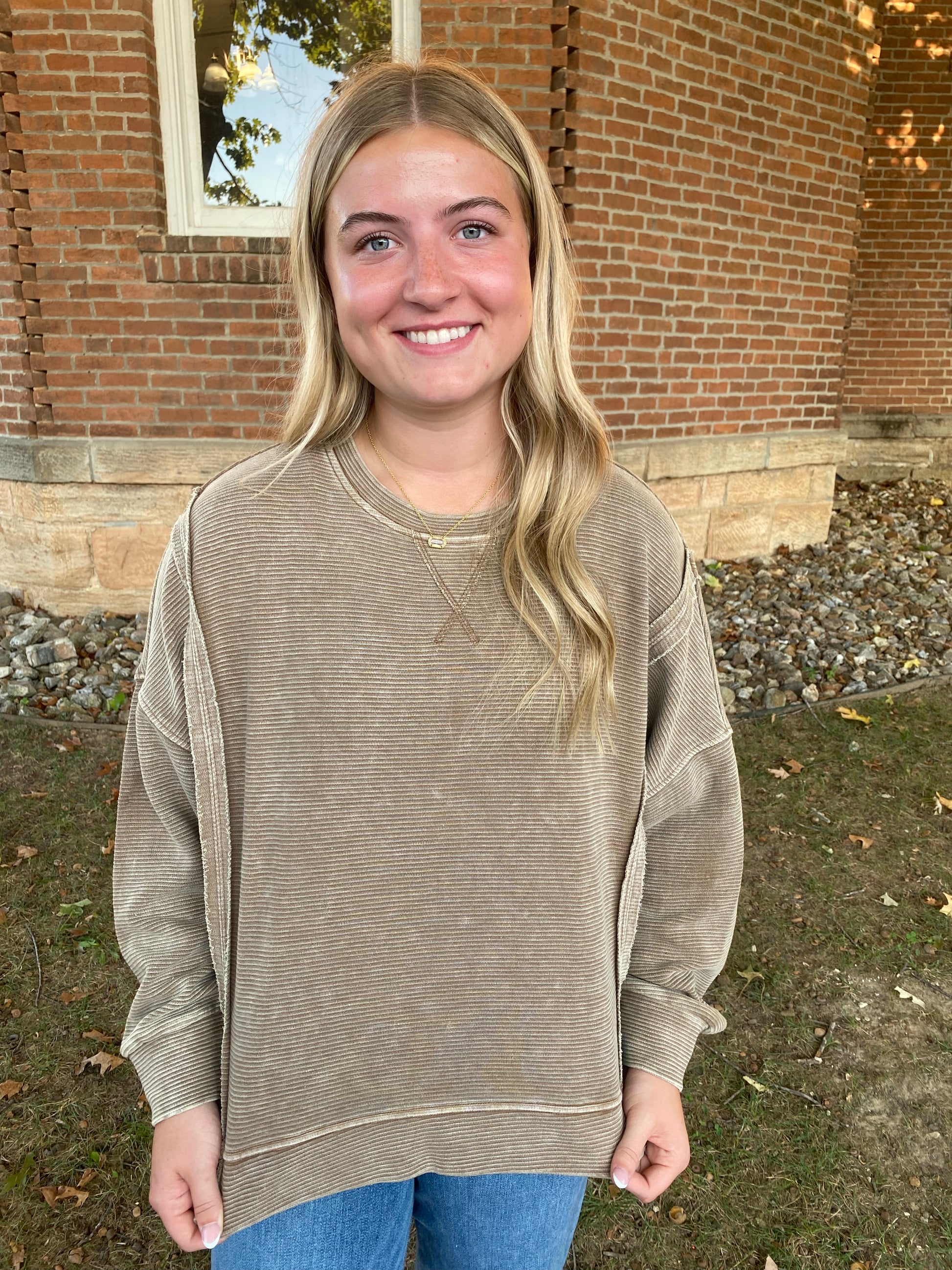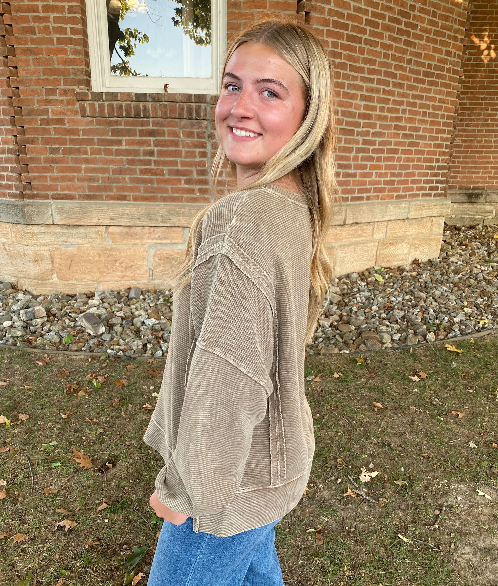 Washed Exposed Seam Side Slit Long Sleeve Knit Top, Brown
