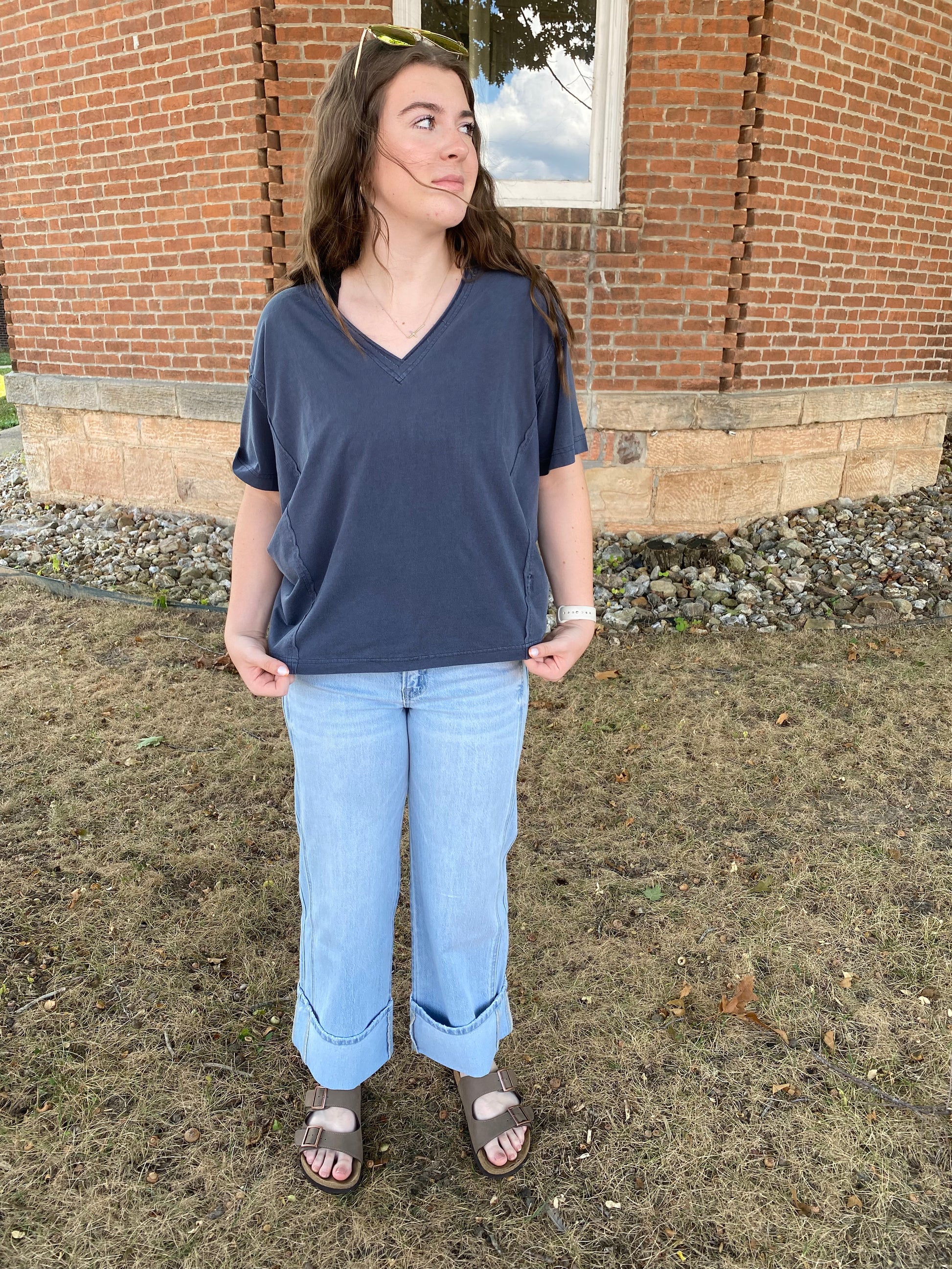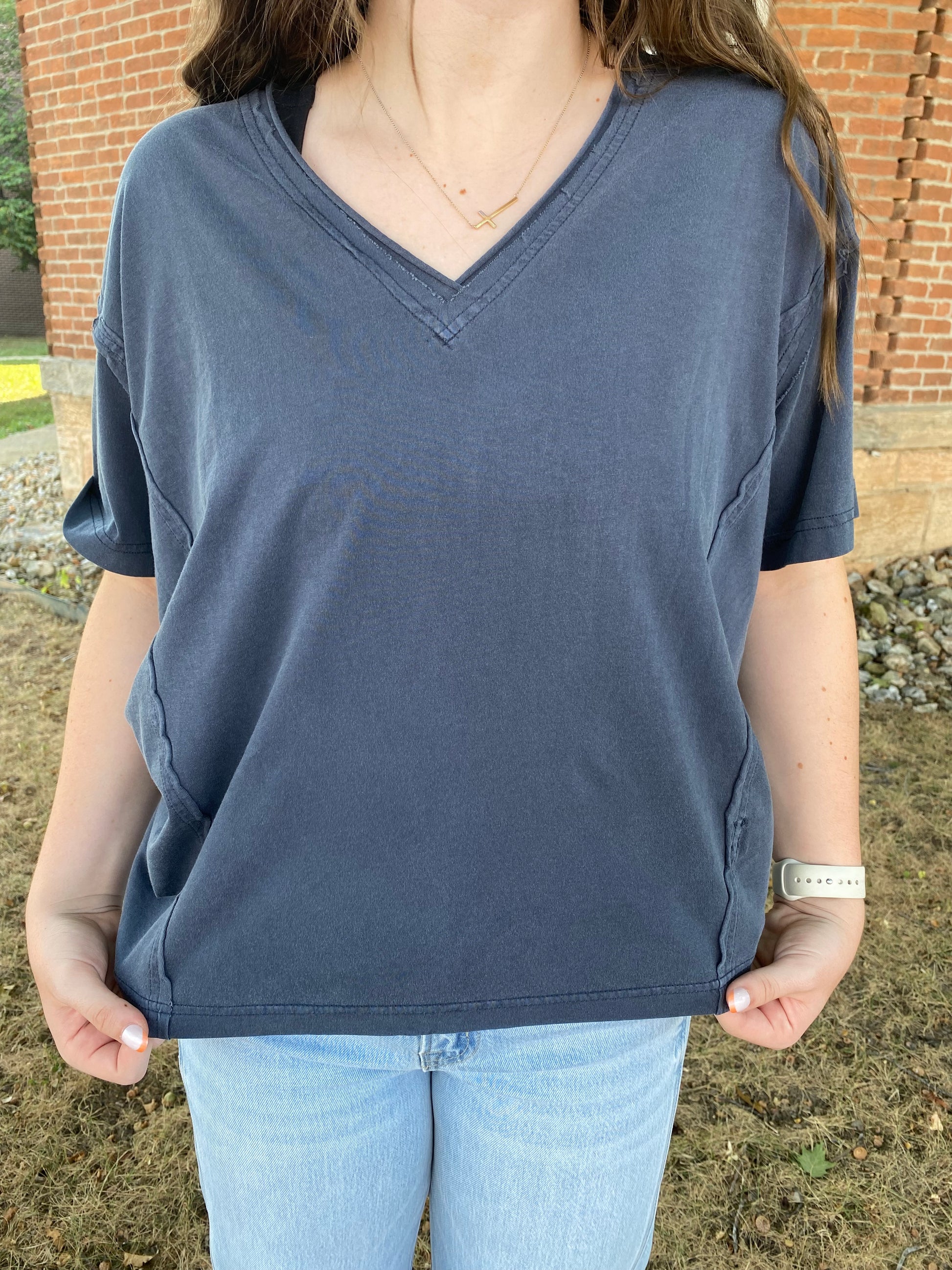 Washed Raw Edge V Neck Short Sleeve Knit Top, Navy